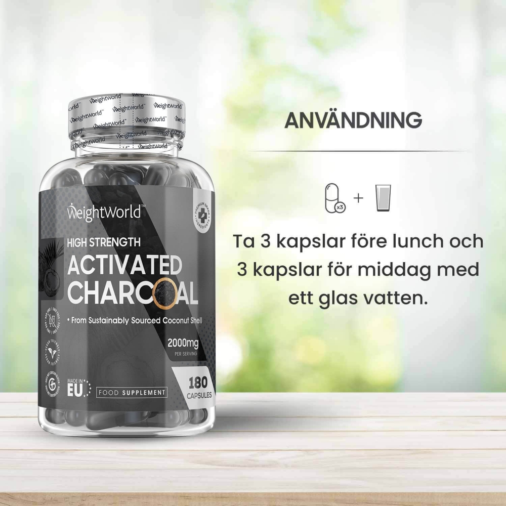 Vi rekommenderar att du tar 3 aktivt kol kapslar 30 minuter före en huvudmåltid 2 gånger om dagen med ett stort glas vatten. Tre kapslar av detta tillskott innehåller 1000 mg aktivt kol, och en daglig dos ger dig alltså 2000 mg aktivt kol.