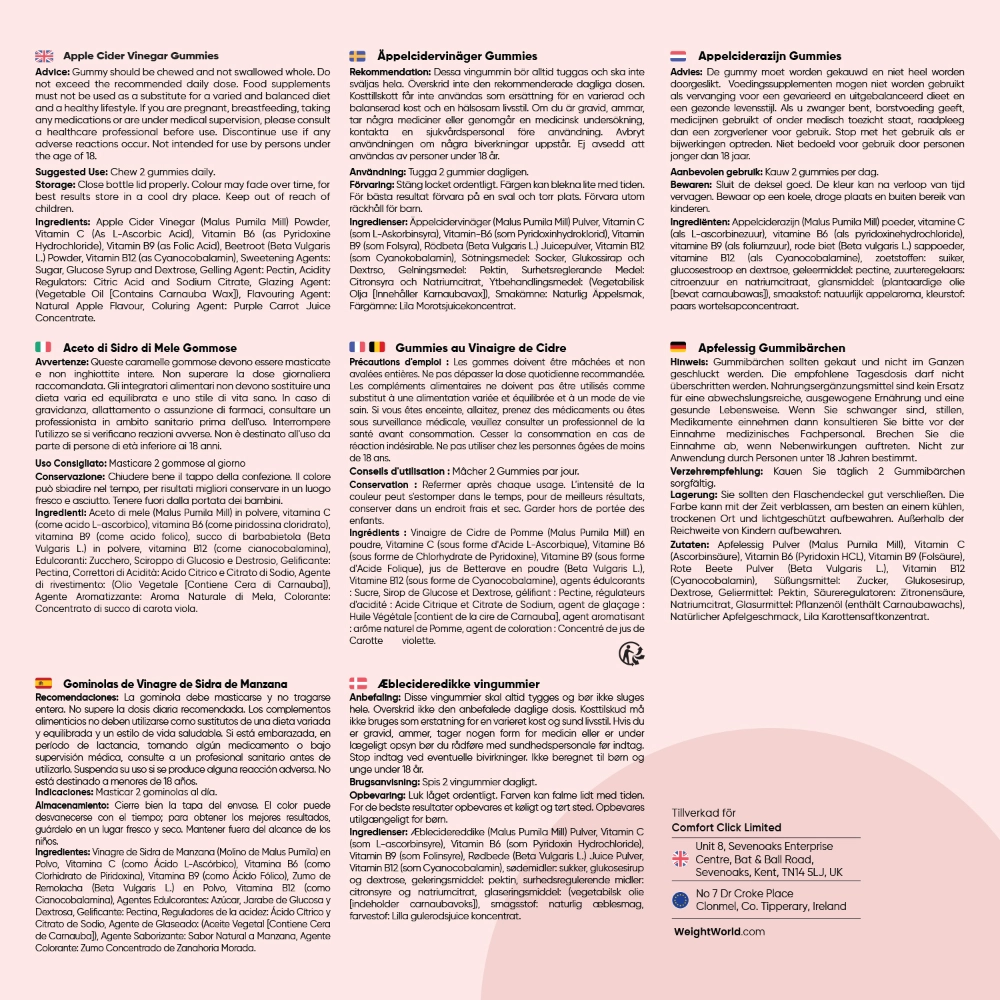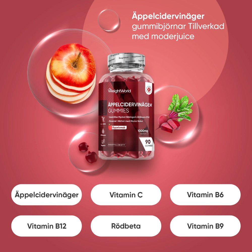WeightWorlds Äppelcidervinäger Gummies är ett välsmakande alternativ till vanlig äppelcidervinäger, som ofta kan vara svår att konsumera på grund av den skarpa smaken. Dessa gummies innehåller en hög daglig dos på hela 1000 mg äppelcidervinäger. De består av 5% ättiksyra för att ge dig extra stöd för mättnad, aptitkontroll och sötsug, vilket kan ge din viktminskning en knuff i rätt riktning. Tillskottet innehåller även vitamin C, B6 och B9.