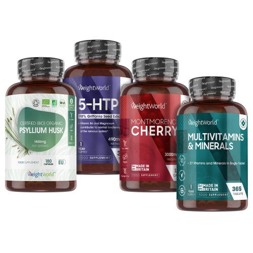 Paketet innehåller en burk med Psyllium Husk, även kallade loppfröskal kapslar, för matsmältningen, samt en burk med 5HTP-tabletter för normal serotoninproduktion, vilket är viktigt för ditt humör.