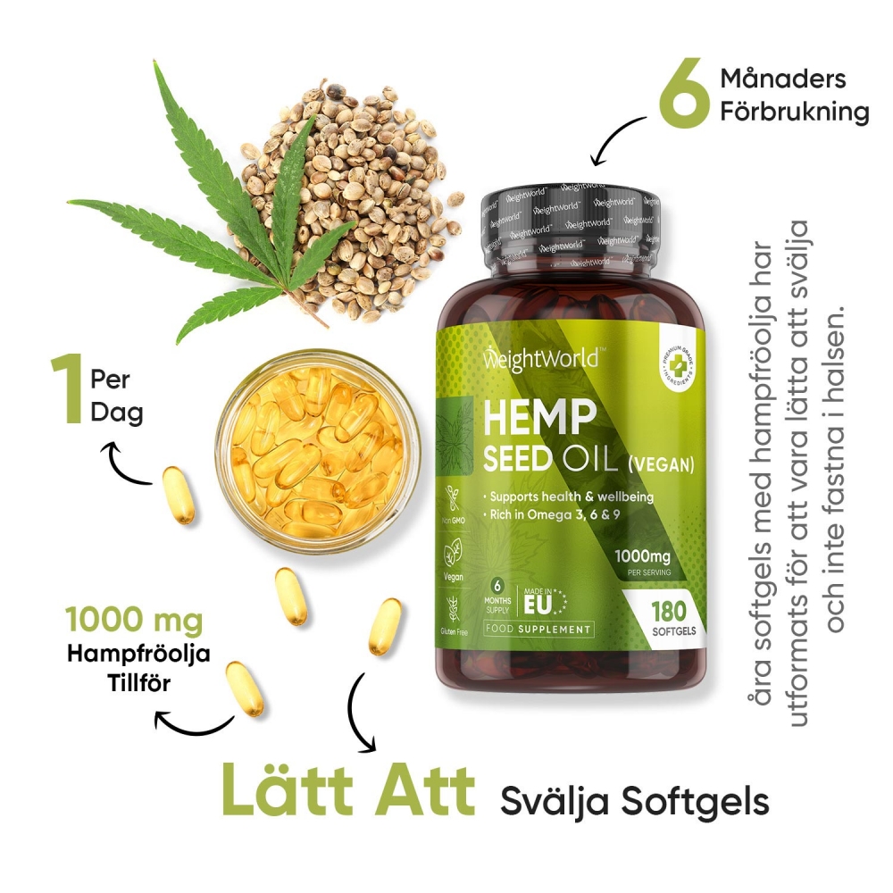 - Hampaolja med omega-3, 6 och 9 fettsyror för hjärna och hjärta