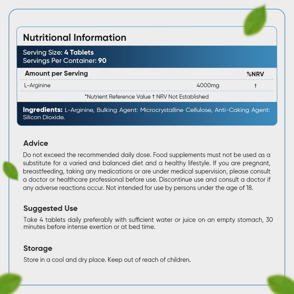 Vi rekommenderar att du tar 4 L-arginin tabletter dagligen med ett stort glas vatten, på fastande mage, 30 minuter innan träning eller vid läggdags.