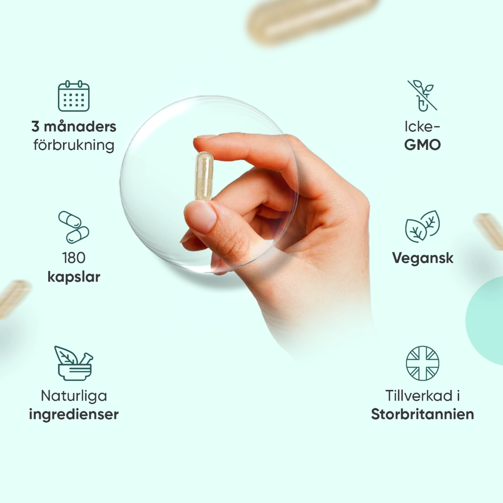 - 180 kapslar - Tillräckligt för 3 månaders konsumtion