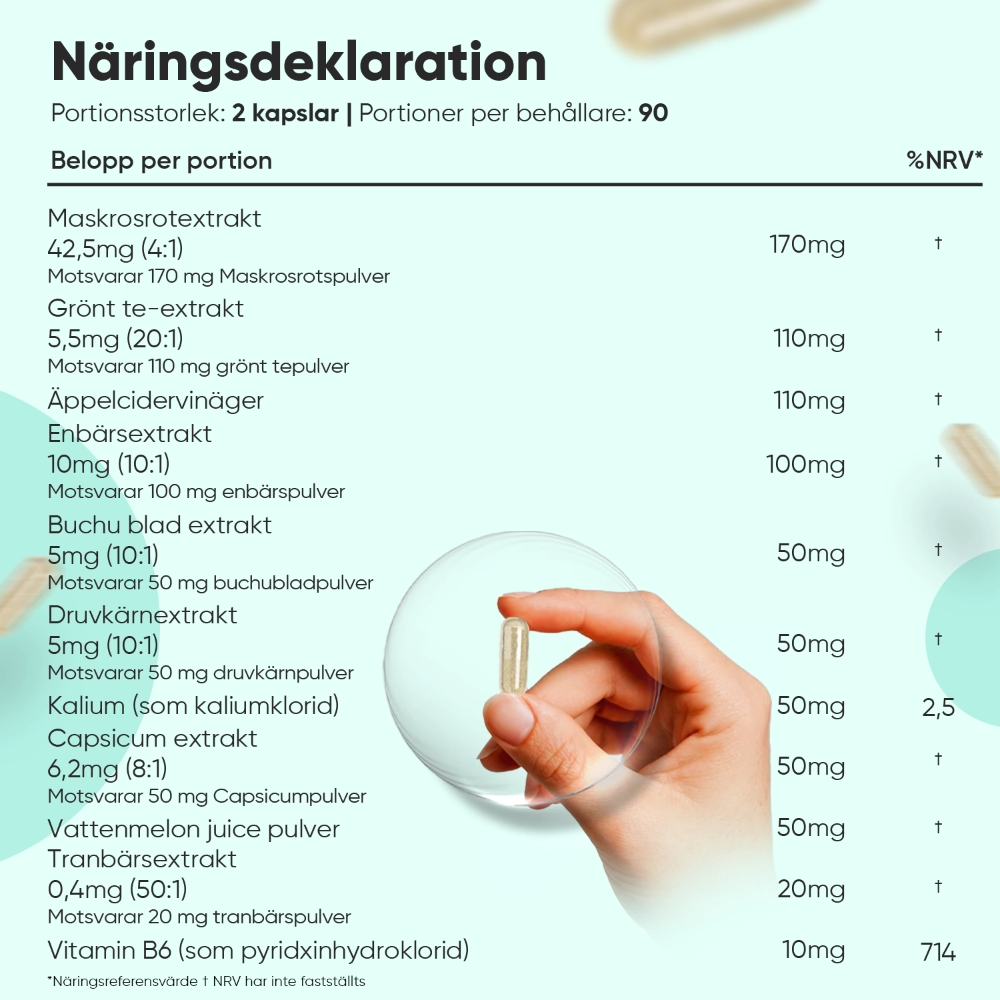 Water Away är helt vegansk, glutenfri och producerad under strikta standarder. Med 180 kapslar per förpackning har du tillräckligt för 3 månaders användning.