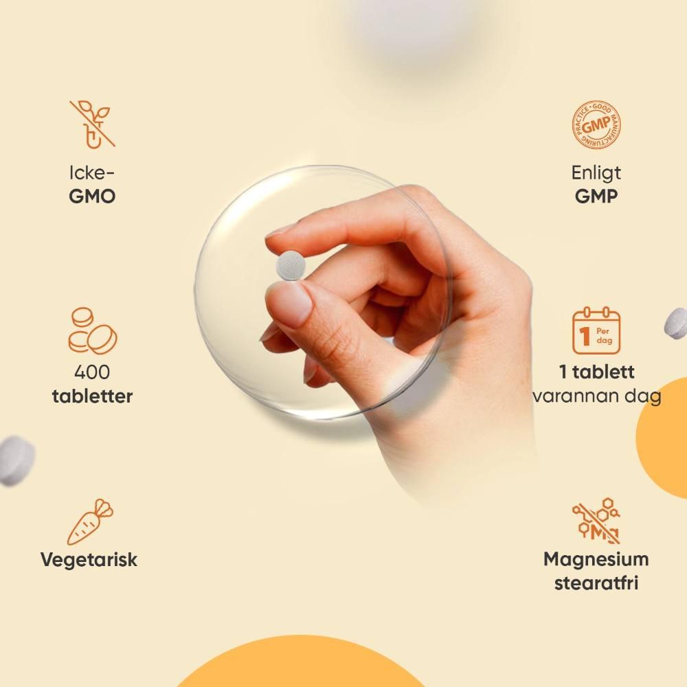 - Ta 1 tablett dagligen - tillräckligt i 400 dagar